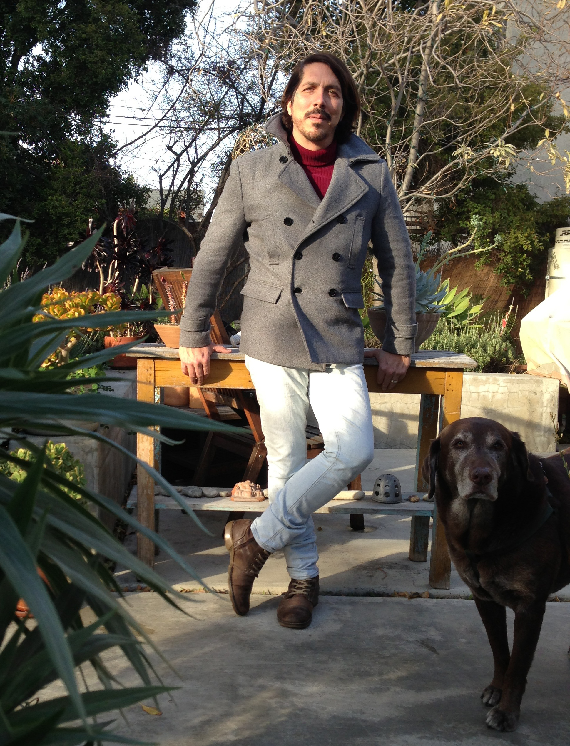 The jacket and the boots you have seen. I keep it fresh and different adding color with the turtleneck and different jeans. Which are, as you can see, not as fitted as I usually go.