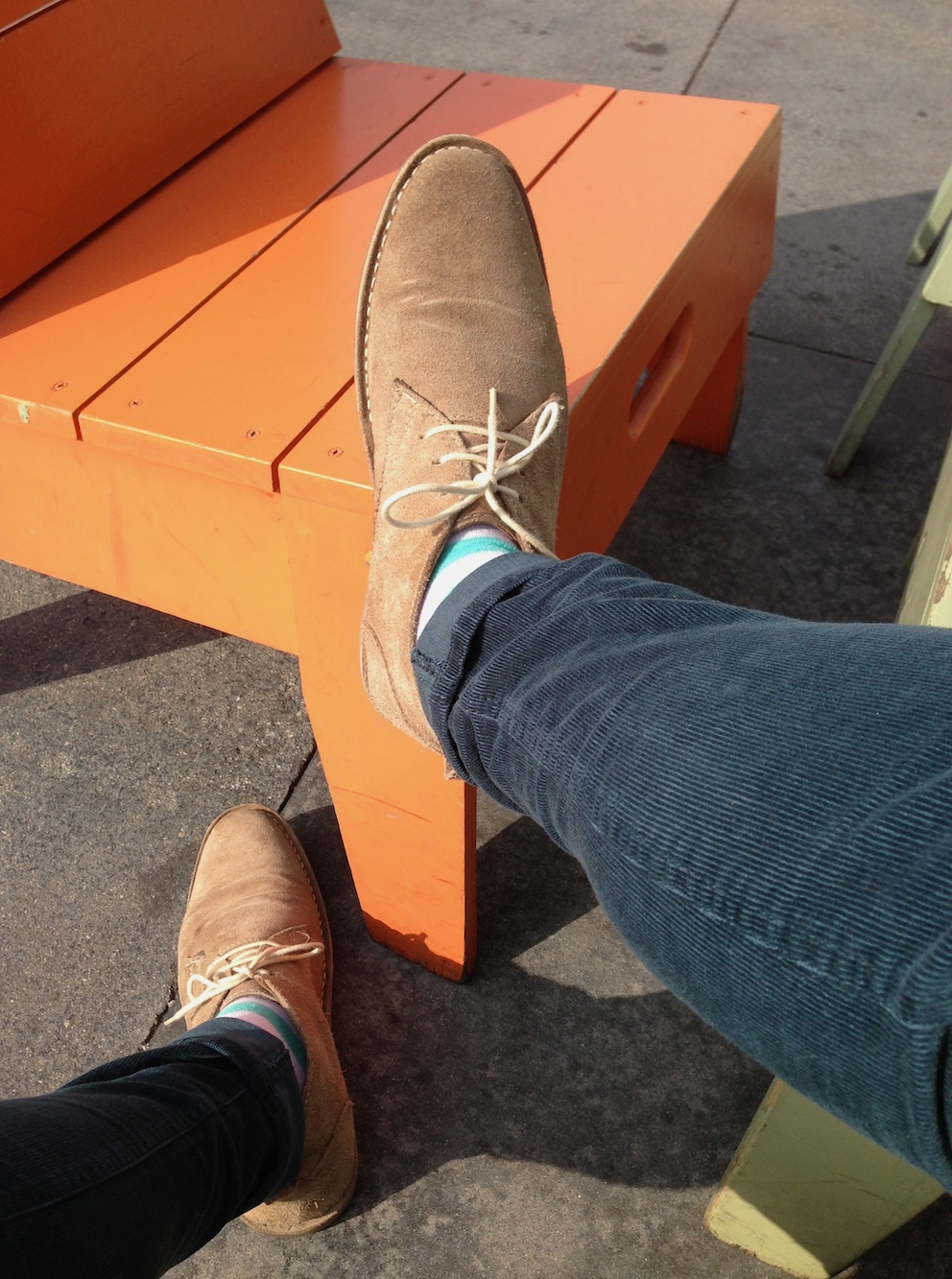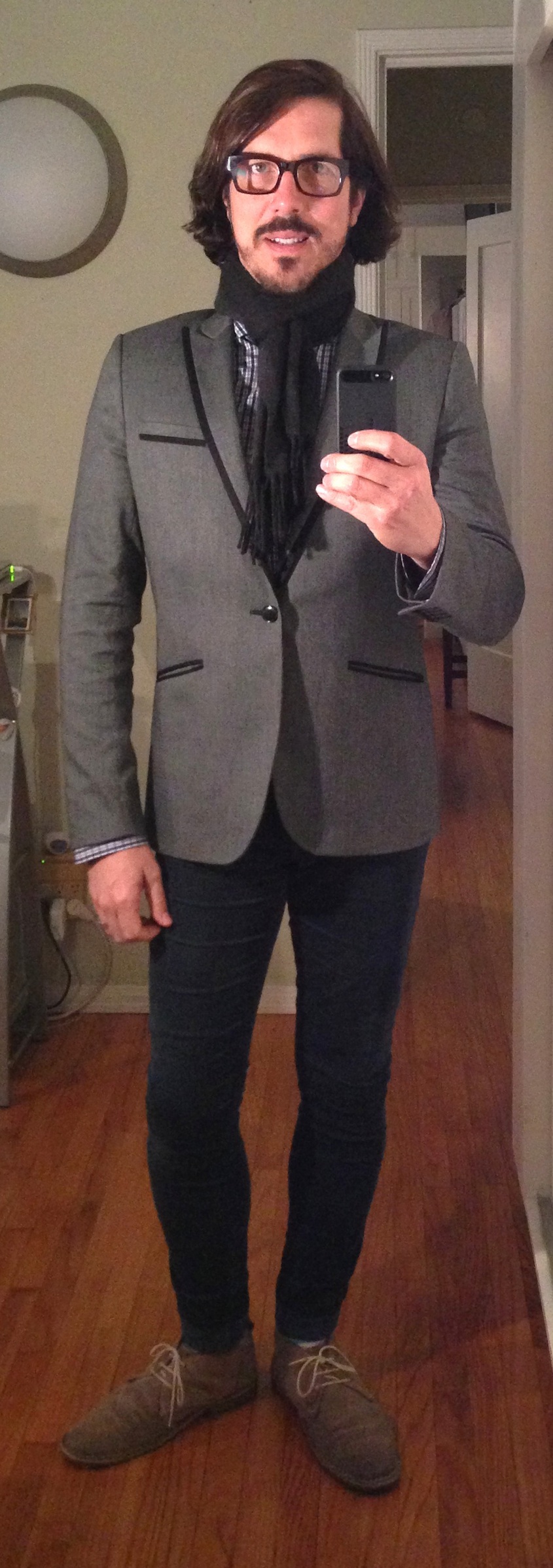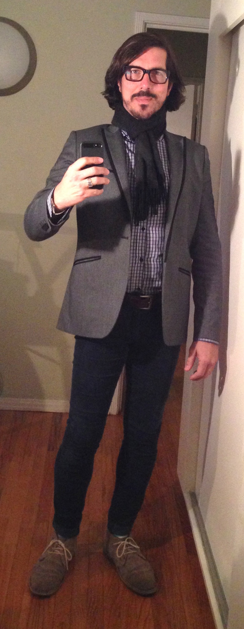 I wanted to look cool but simple to meet with my Agent and I accomplished it by combining corduroy skinny jeans, jacket, swede shoes and a scarf. Fun, a little irreverent but nice.