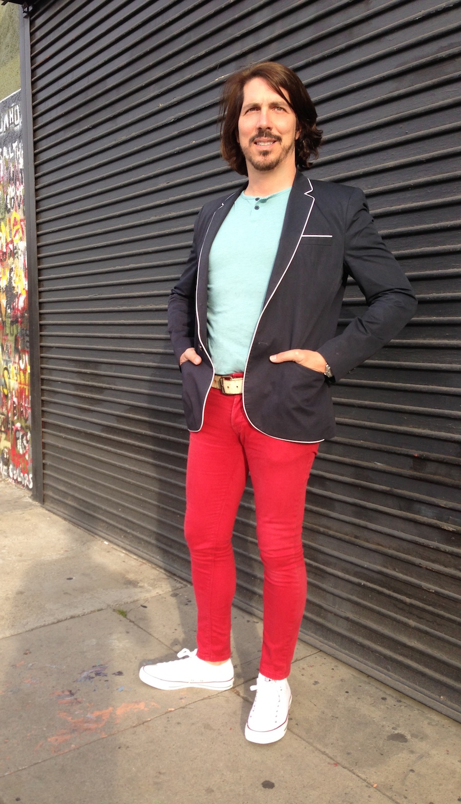 My red skinny jeans are from h&m, as well as my jacket, and the baby blue cotton t-shirt is from Topman.