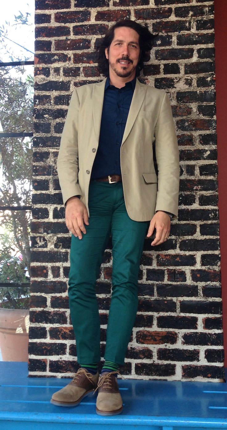 My green pants are from Topman, my shirt from h&m, my jacket fro Hugo Boss and my new shoes are Michael Shannon. You can also see a little bit of my Ben Sherman socks. I love how the soles of the shoes are the same color of the bench I am standing on.