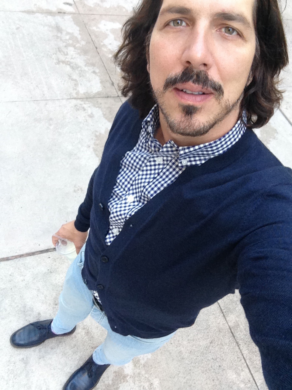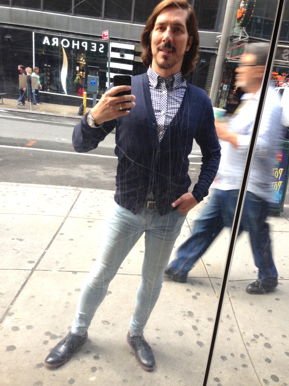 I’m wearing skinny jeans by Topman. Shirt and Cardigan by Ben Sherman and shoes by Kenneth Cole.