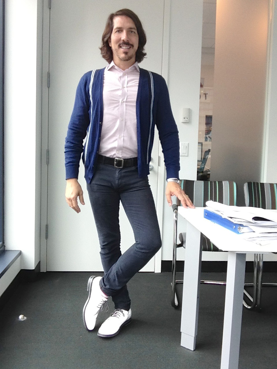 I’m wearing skinny jeans from April 77, a shirt by H&M, cardigan by Ben Sherman and shoes by Cole Haan.