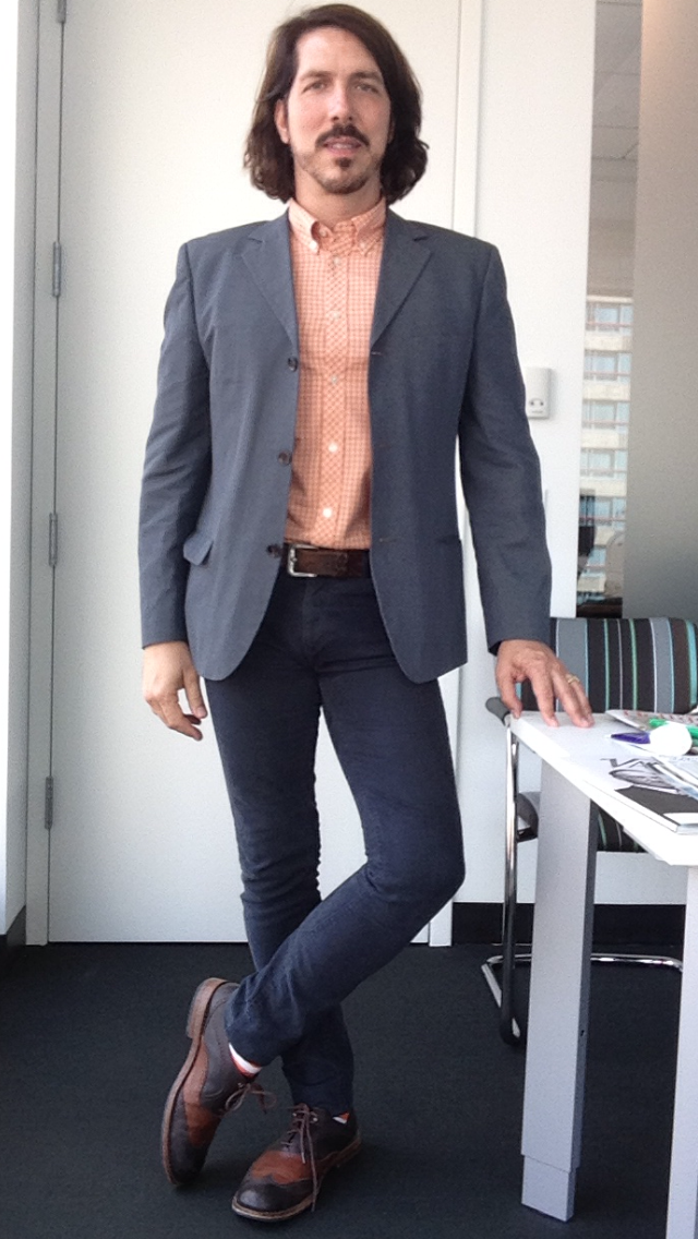 Today I’m wearing skinny jeans by April 77, blazer by Ermenegildo Zegna, shirt by Ben Sherman and shoes by Wolverine 1000 Mile.