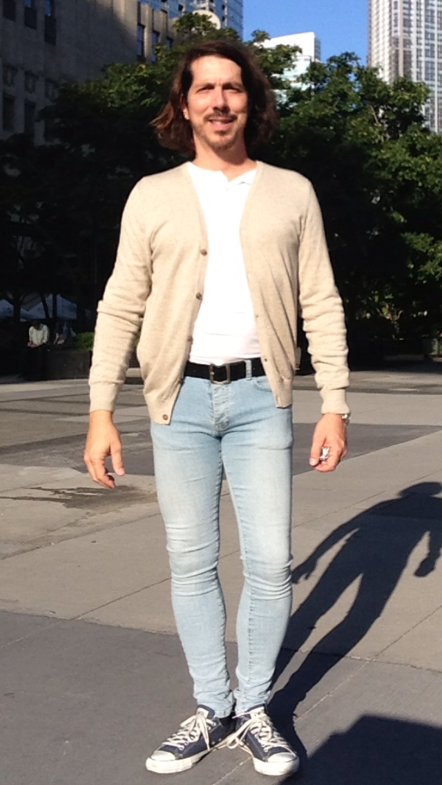 I’m wearing skinny jeans by Topman, shirt and cardigan by H&M and shoes by Converse.