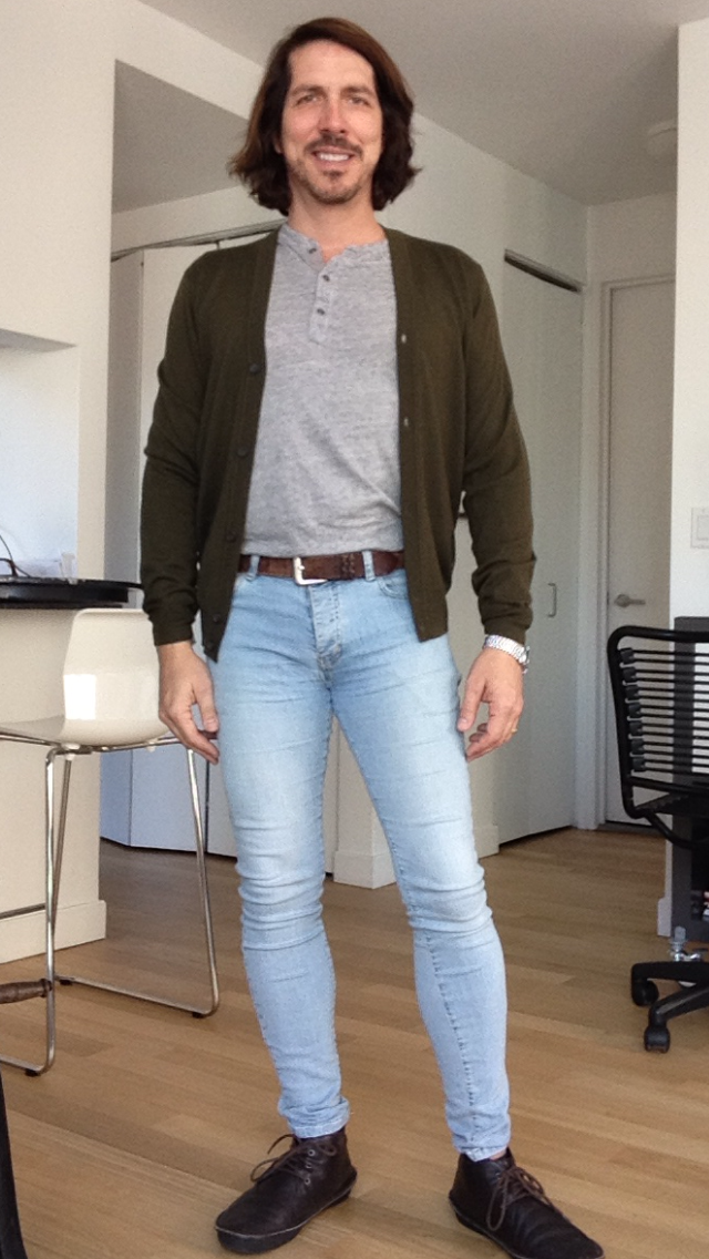 I’m wearing skinny jeans by Topman, a shirt by H&M, a cardigan by Ben Sherman and shoes by Camper.