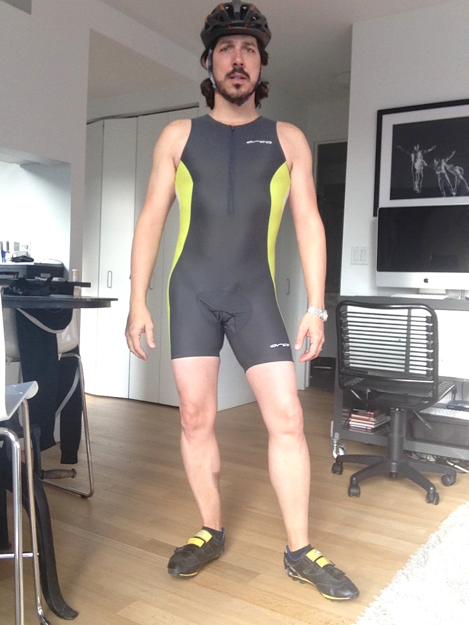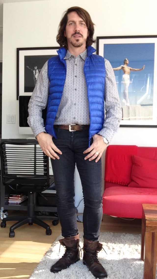 I am wearing skinny jeans by AllSaints, shirt by Ben Sherman, vest by UniQlo and new boots from Aldo. My biking gear is: suit by Orca and shoes by Shimano.
