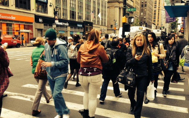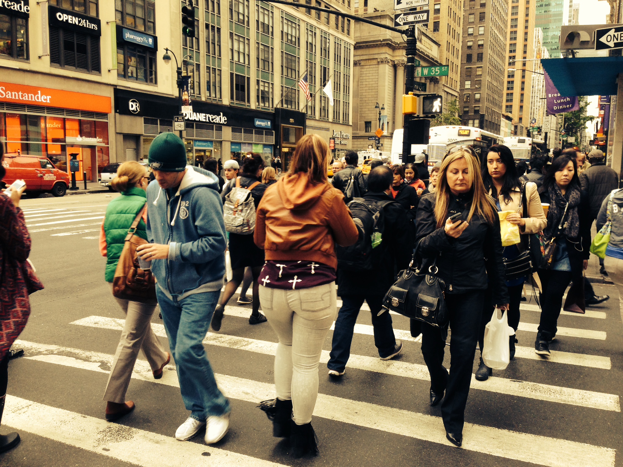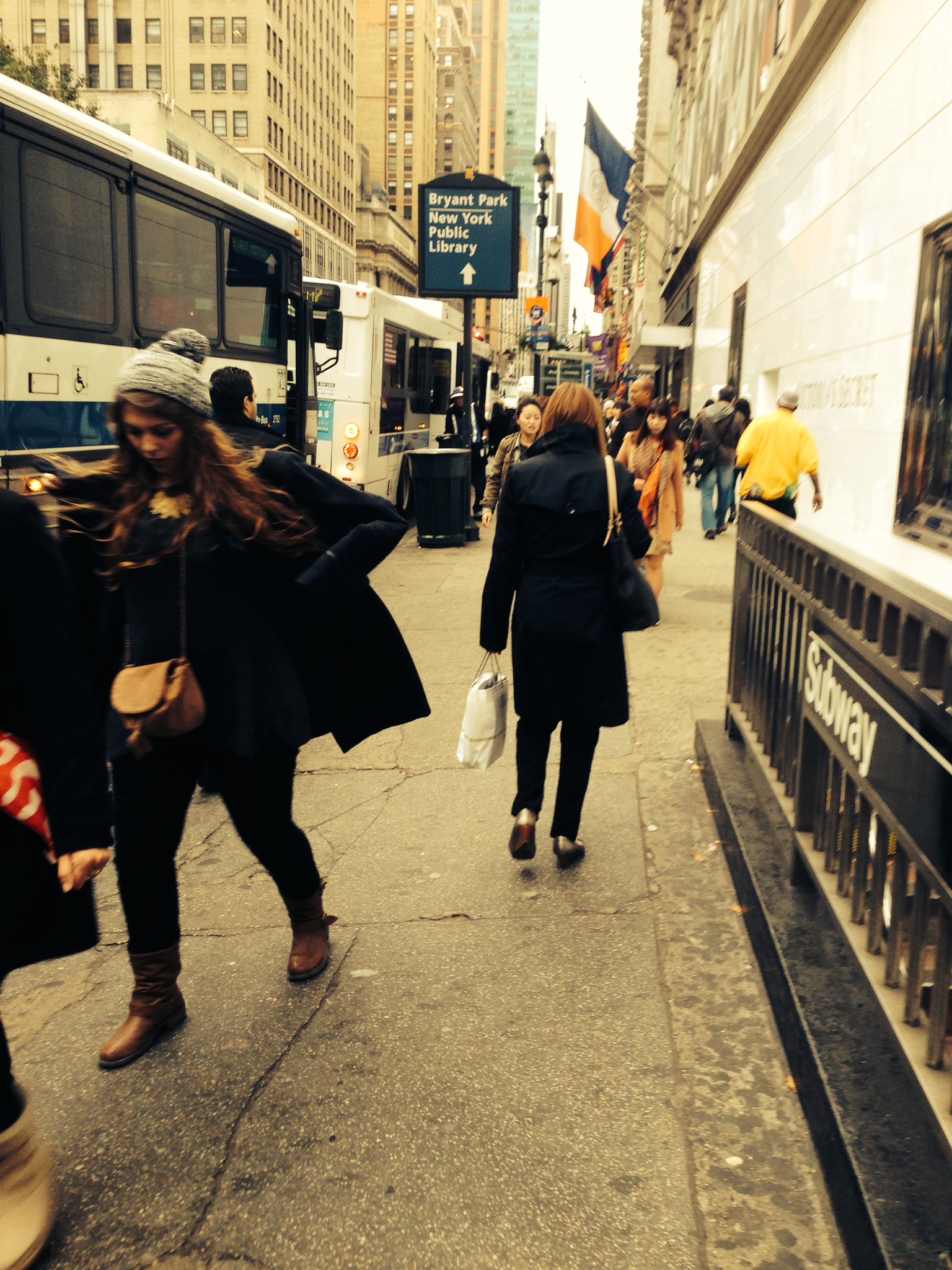 If you follow me regularly, you know that the temperature has been changing in the last couple of weeks here in New York City. Autumn is here and you breath a different air. But it was until today that I noticed that everyone, I mean everyone, wore cold weather clothes. Before you would see people on t-shirts and some withs scarfs and others like we were in Miami. Today was different. I think today is the day Fall officially made an entrance in people’s minds. I am sharing two pictures I took this morning on my way to work on 6th ave.