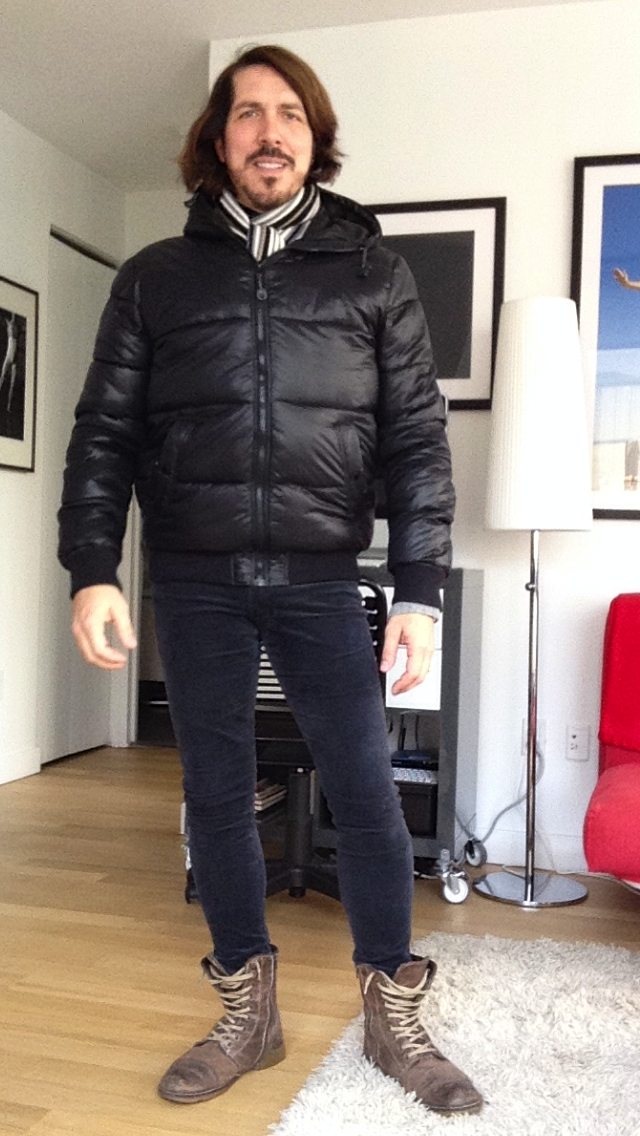 Today I am wearing skinny corduroy jeans by Express, t-shirt by GAP, sweater and jacket from H&M. Boots by Aldo. My cool hat that I am wearing in the black and white picture is from UniQlo.