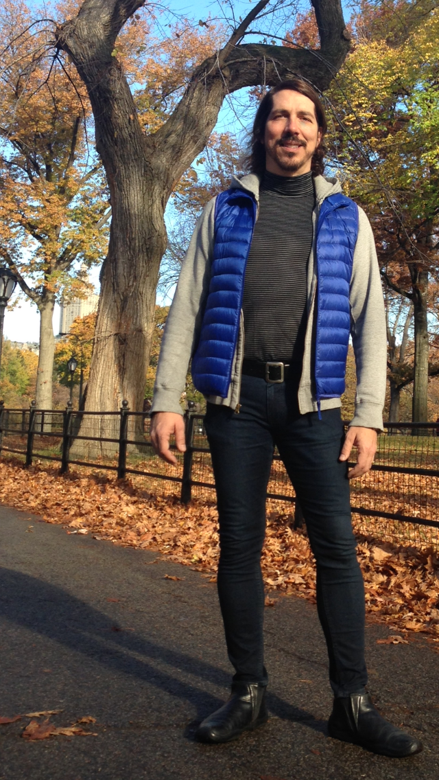 I wore skinny jeans by Topman, hoody by Gap, turtleneck and vest by Uniqlo and shoes by Prada.