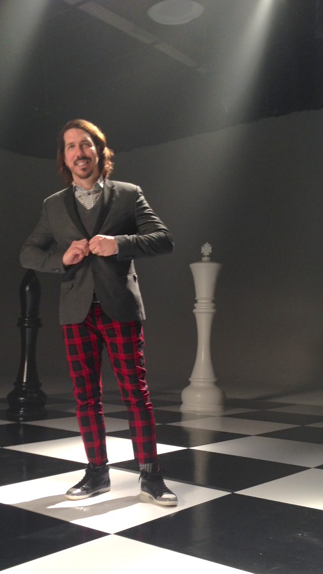 My pictures today were taken on the set, and I am wearing skinny pants and jacket by Topman, shirt and sweater by H&M and sneakers by Prada.