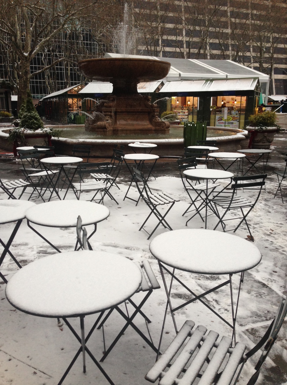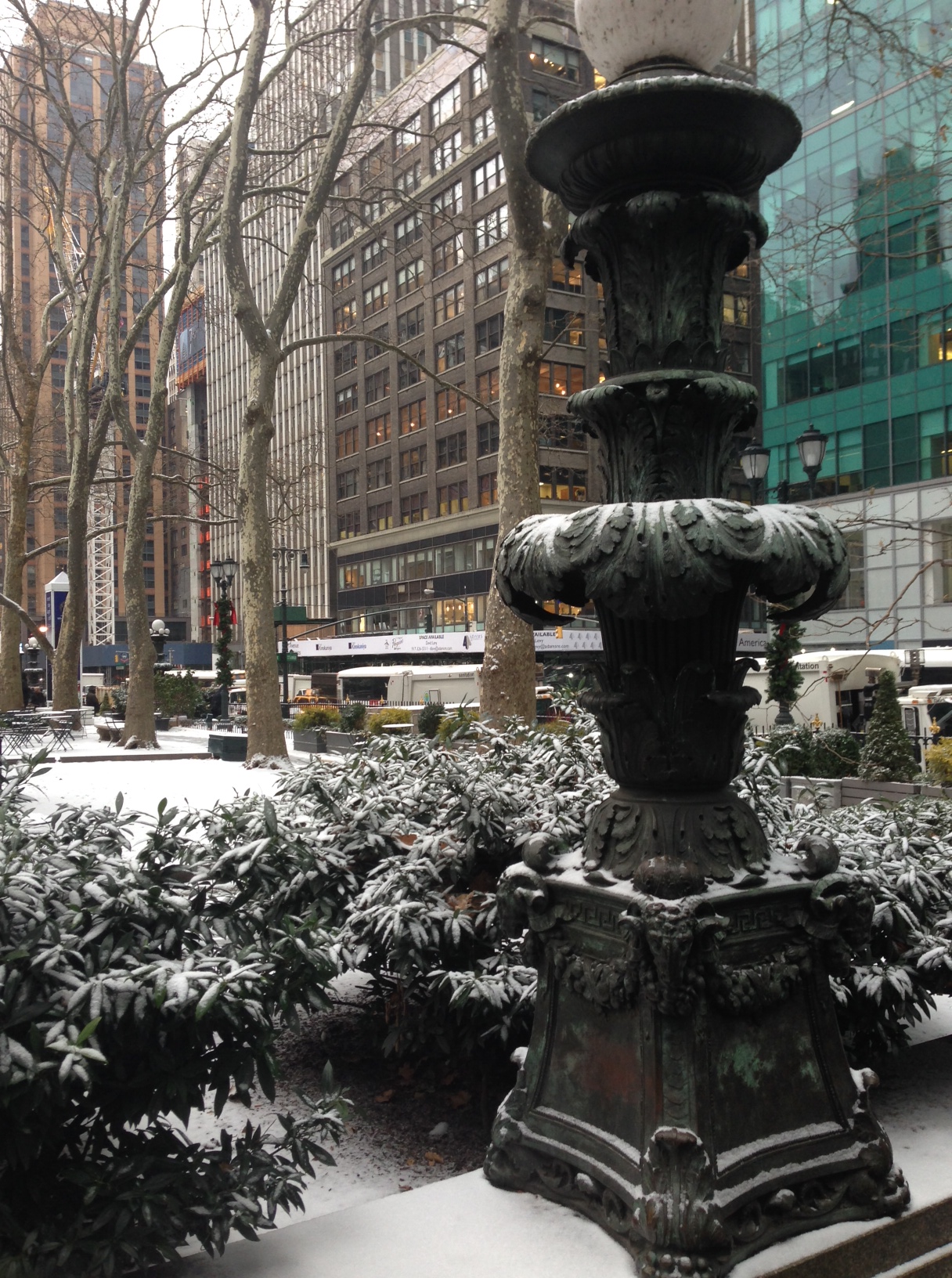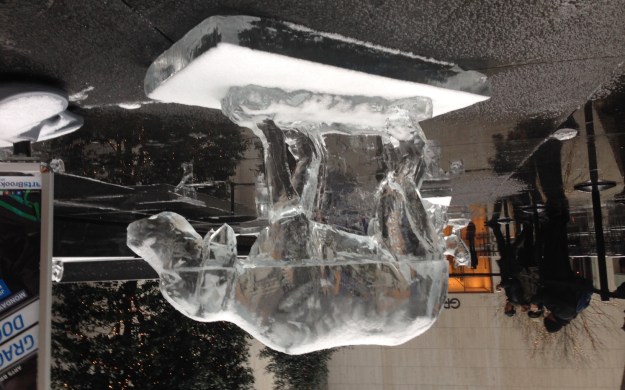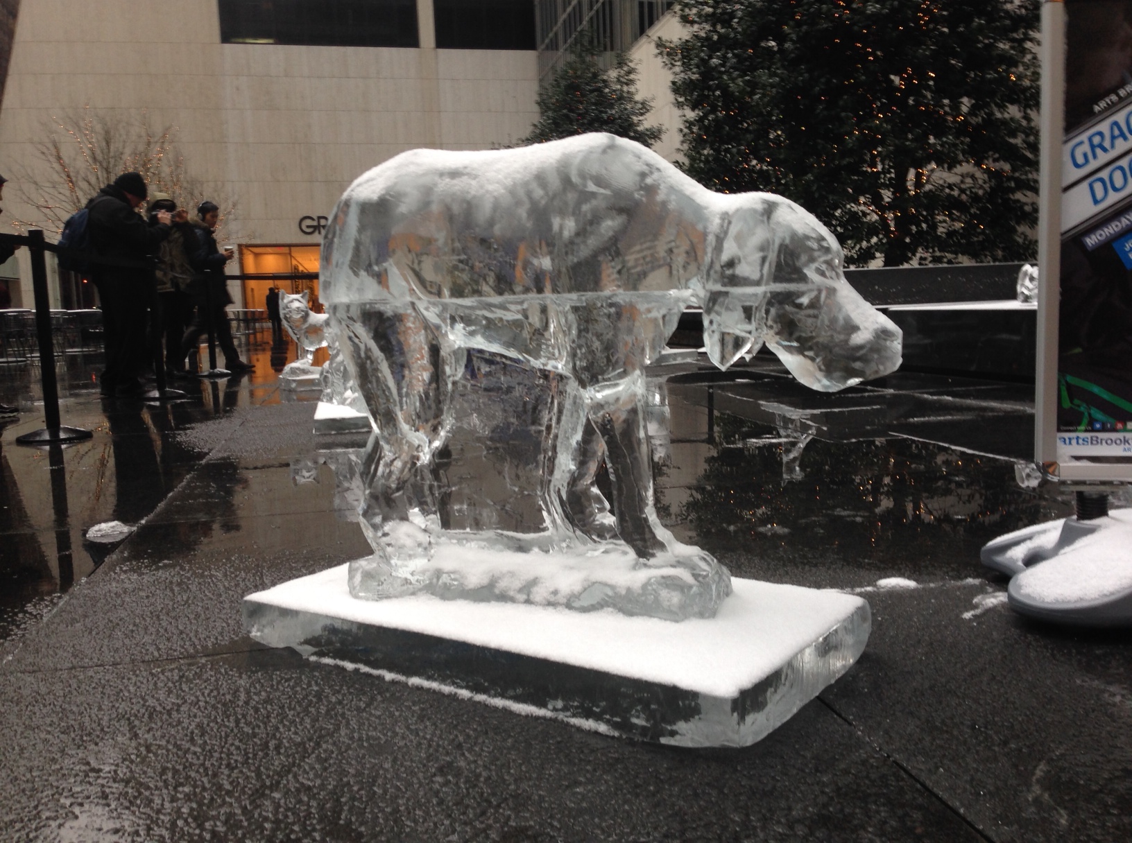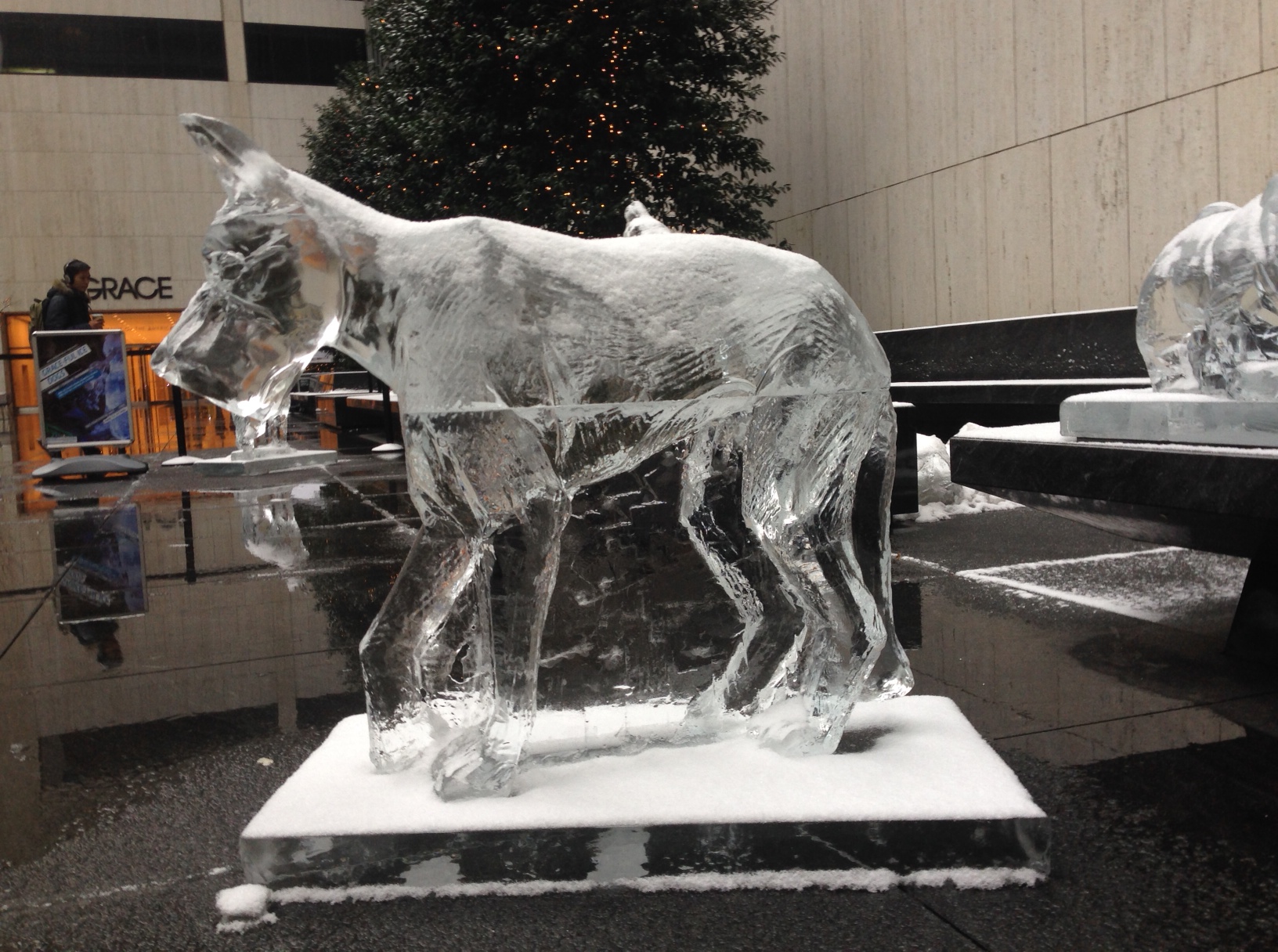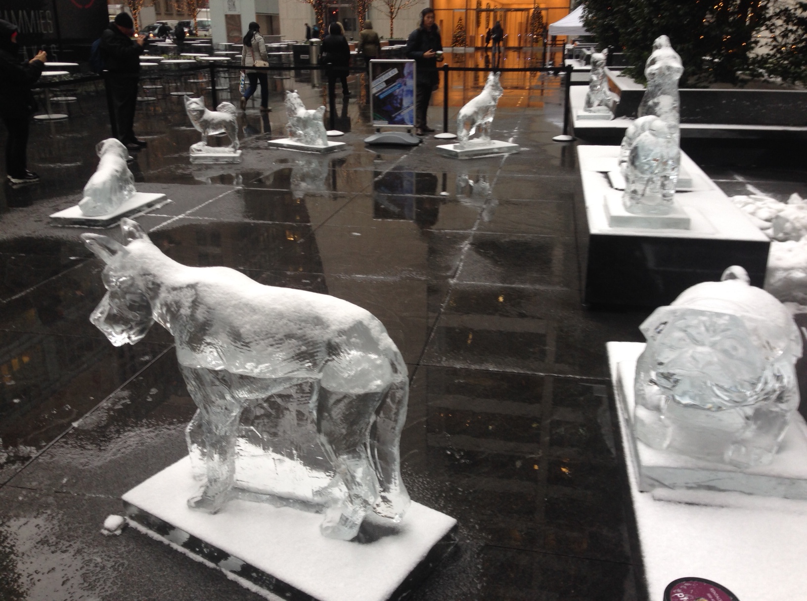 It was cold and snowy and gray today in NY while L.A. was warm and sunny and vibrant. I am including a picture of the computer screen with the readings for both cities, so you can see it was true. I am also including pictures of mid town Manhattan that I took from my apartment, on my way to work and from my office. All covered with snow. I love the pictures I took of ice sculptures of dogs that I saw on my way to work. They were really cool.