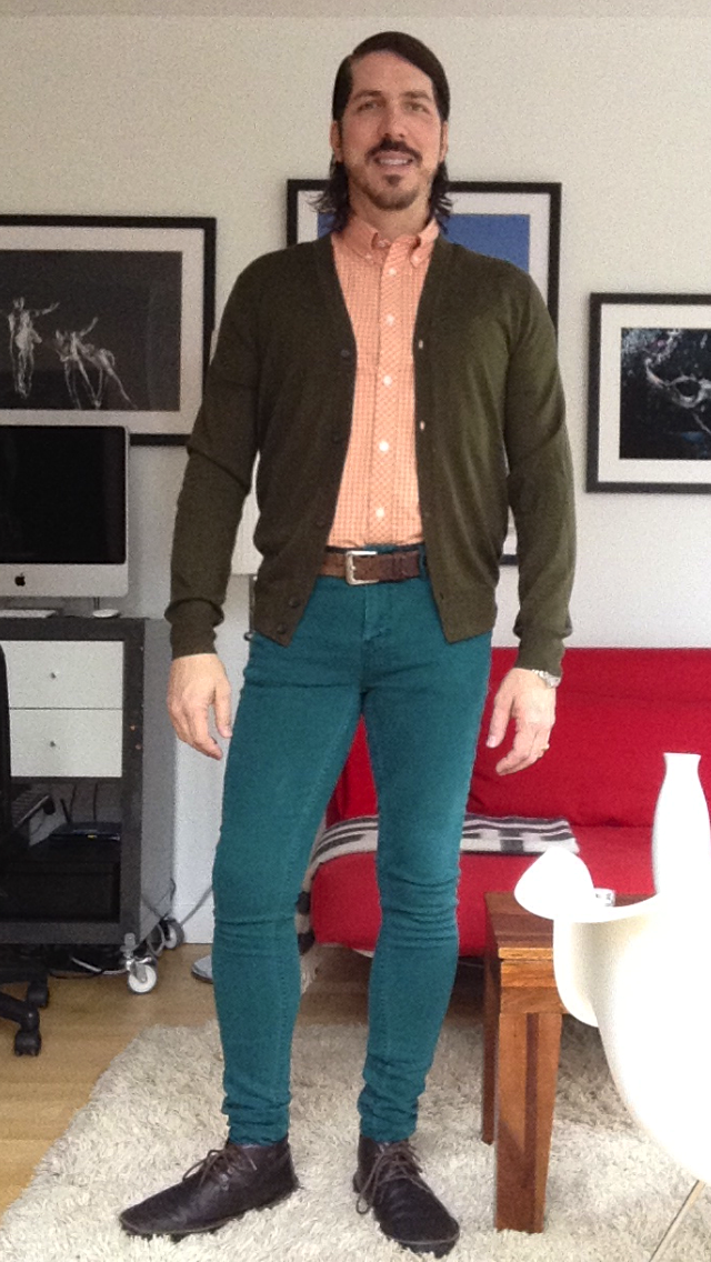I wore today skinny jeans by TopMan, shirt and cardigan by Ben Sherman and shoes by Camper. In the morning, to work out, I wore running tights by Game Gear, t-shirt by H&M and vest by UniQlo. Shoes by Adidas.