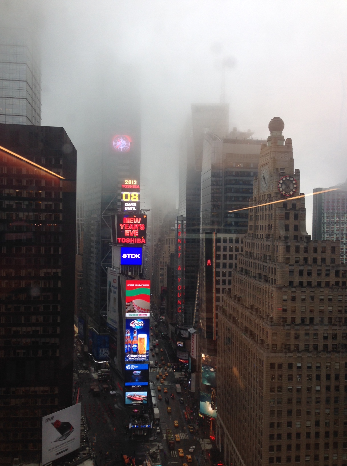 Today, the rain never stopped in New York City. The clouds were really low and I got a couple of really cool pictures from the 28th floor above Times Square.