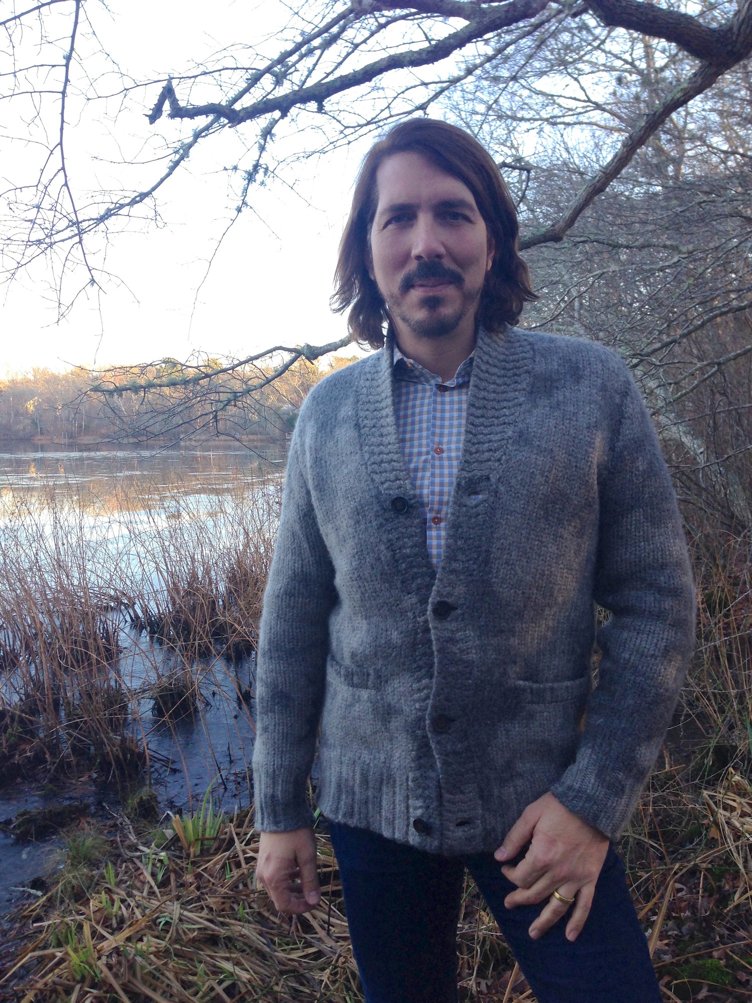 I am wearing skinny jeans by TopMan, shirt and shoes by Ben Sherman and wool cardigan by John Varvatos.