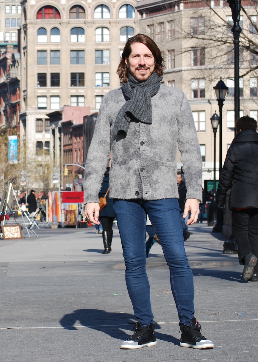 Today I wore skinny jeans by TopMan, wool sweater by John Varvatos, coat and shirt by UniQlo and shoes by Prada.