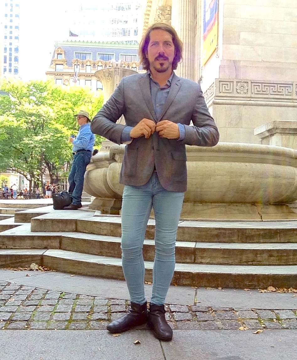 In the photos I am wearing skinny jeans and blazer by TopMan, a shirt by Benetton and boots by Prada. It is not easy to dress for the heat in New York City during the summer.